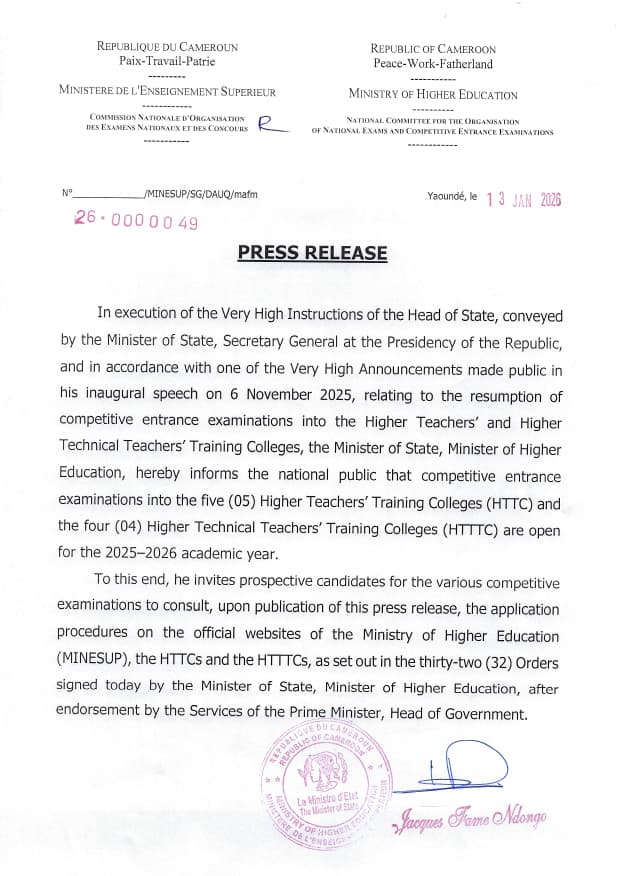 The vice-Chancellor of the University of Bamenda, informs the General Public that the Admission of Private Candidates into Years One of the First and Second Cycles, of the Higher Teacher Training College, Bambili, is opened for the Academic Year 2025/2026 in the following departments : Download